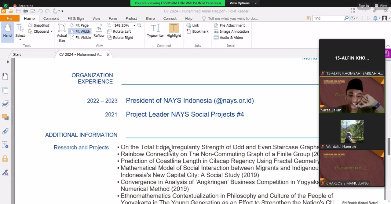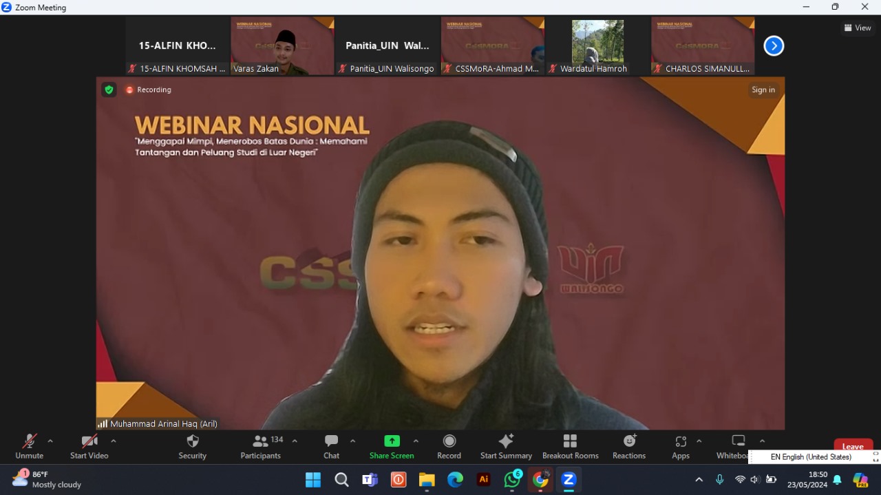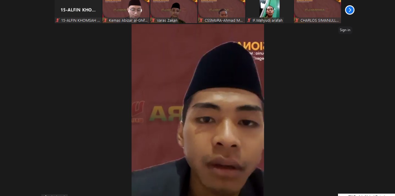 Webinar Nasional CSSMoRA dimoderatori oleh Varas Awla Zakan Tajalla dan menghadirkan narasumber luar biasa Muhammad Arinal Haq yang saat ini sedang menempuh jenjang S2 di Manchester, Inggris sekaligus mendapatkan beasiswa LPDP Luar Negeri. Beliau merupakan presiden NAYS Indonesia dan seorang penulis buku yang berjudul Pada Sebuah Jalan Panjang Bernama Pulang.