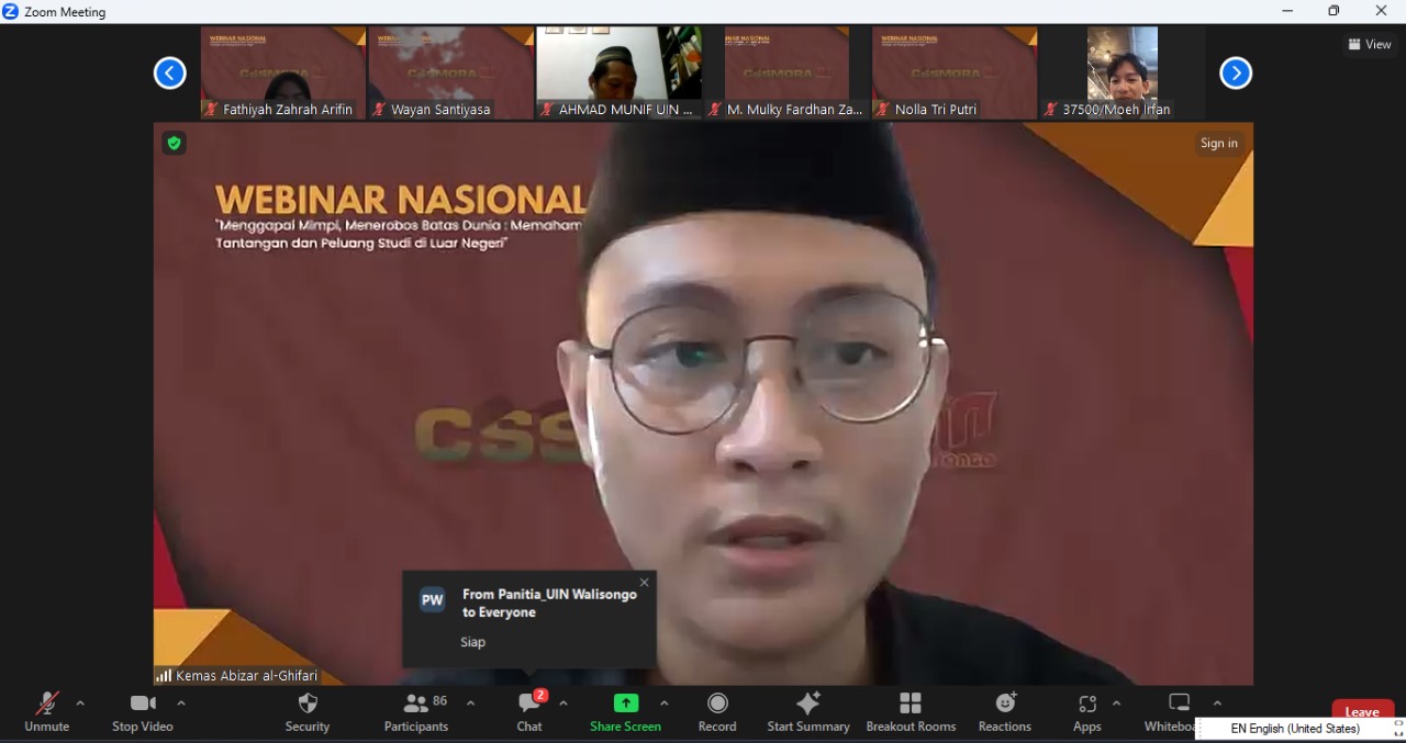 Menuntut ilmu merupakan kewajiban bagi setiap manusia, semakin jauh perjalanan kita menuntut ilmu maka semakin banyak kita mendapatkan pengetahuan-pengetahuan yang luas. Salah satunya bisa belajar di Luar Negeri adalah sebuah kesempatan yang sangat diinginkan oleh banyak orang. Kini, Departemen P3M atau Departemen Pemberdayaan Pesantren dan Pengabdian Masyarakat CSSMoRA UIN Walisongo kembali menghadirkan Webinar Nasional bertajuk tema “Menggapai Mimpi, Menerobos Batas Dunia; Memahami Tantangan dan Peluang Studi di Luar Negeri”. Kegiatan ini dilaksanakan pada hari Kamis, 23 Mei 2024 pada pukul 17.45 sampai selesai dan dilaksanakan melalui via zoom meeting.